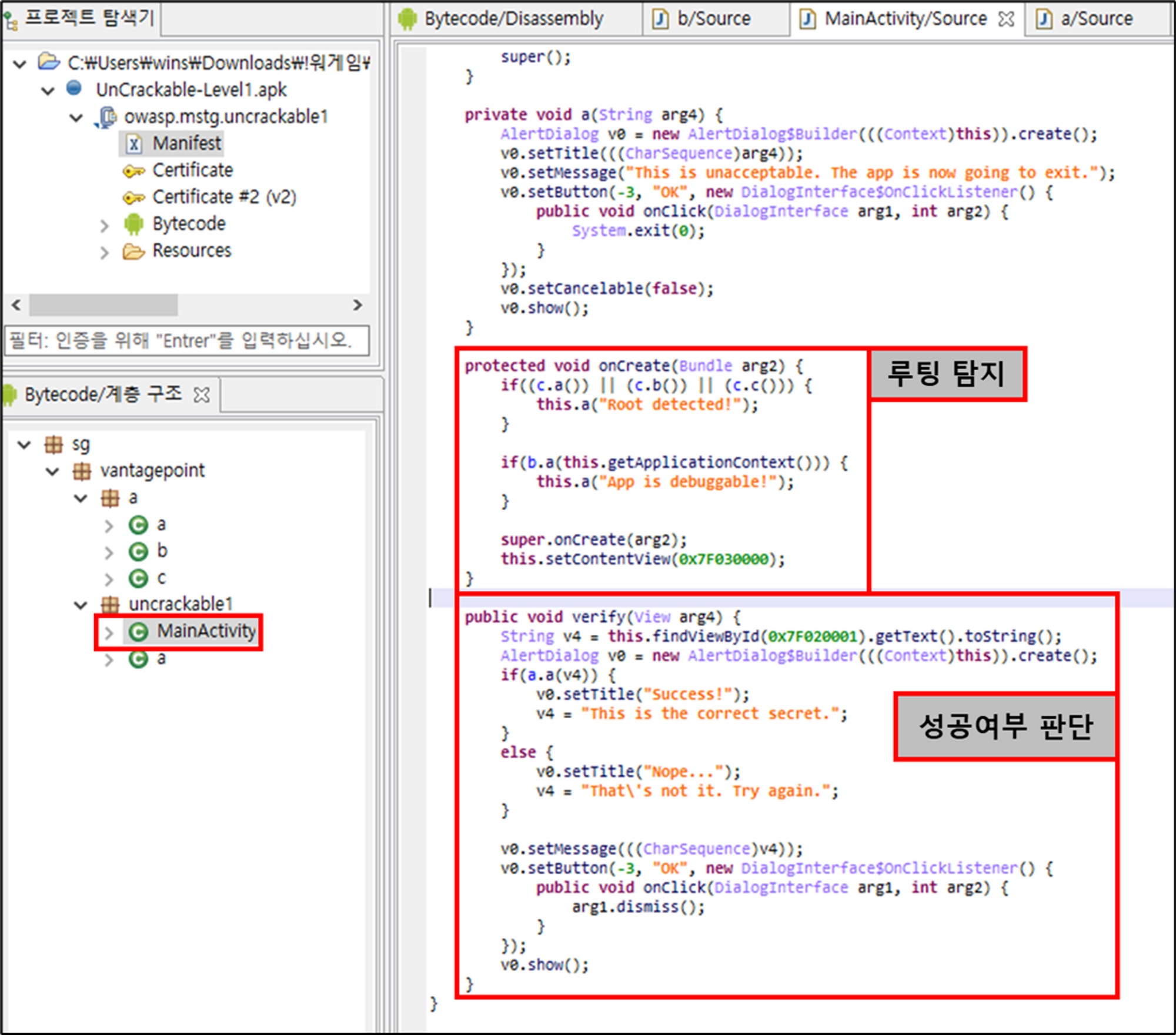 2) 메인 액티비티 sg.vantagepoint.uncrackable1.MainActivity 확인