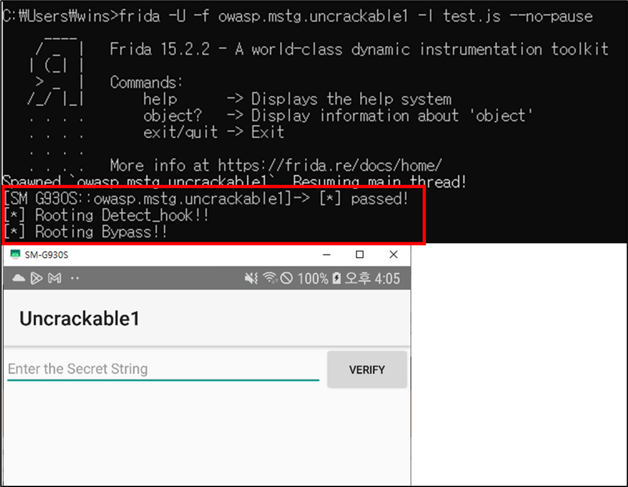5) 루팅 우회 후, 비밀키 입력할 경우 다시 입력하라는 문구 출력