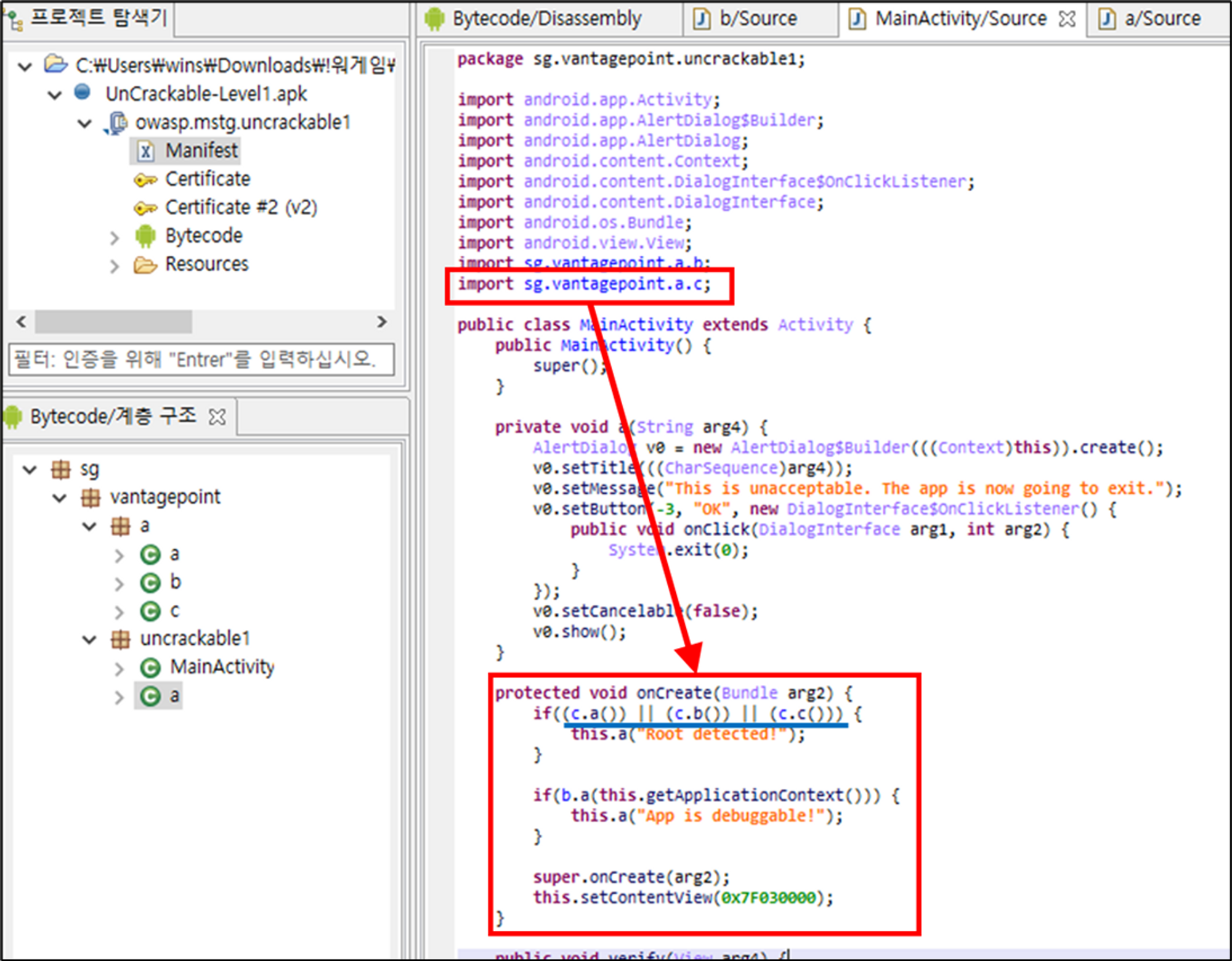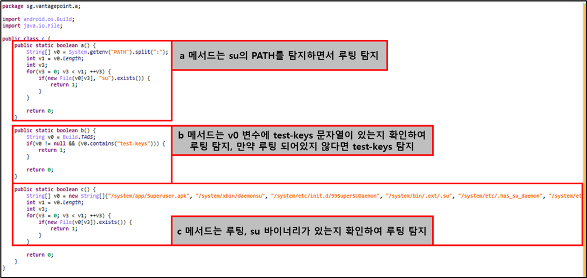 이 루팅을 탐지하는 로직이며, sg.vantagepoint.a 패키지 안의 c 클래스의 a, b, c 메서드를 모두 false를 만족하여야 루팅 탐지가 안되는 것을 확인할 수 있다.